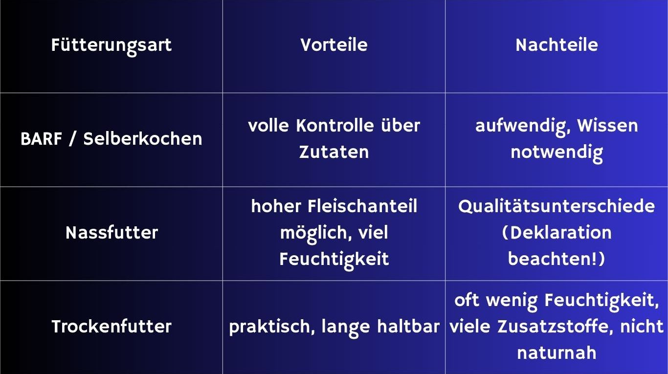 Es gibt heute viele verschiedene Möglichkeiten, Hunde und Katzen zu füttern – zum Beispiel Nassfutter, Trockenfutter, BARF, selbstgekochtes Futter oder Mischfütterung. Jede Fütterungsart hat ihre eigenen Vorteile und Besonderheiten.